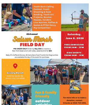 Bring the whole family and come check out our 43rd annual Suisun Marsh Field Day at CWA's own Grizzly Ranch in Suisun City, CA. Come for the activities or vendors, stay for the contests and raffles! Food trucks available as well. This is a Free Event that sees 300-500 people the day of. Will you be one?
