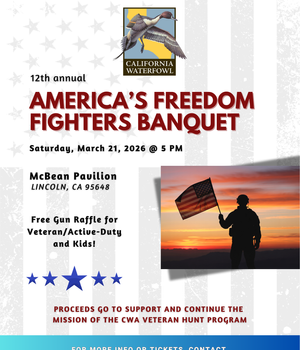 Join CWA to celebrate our 12th annual America's Freedom Fighters Banquet at the McBean Pavilion in Lincoln, CA. Free Gun Raffle for Veteran's/ Active-Duty Military and Kids! Tickets will go fast. Get Yours Today!