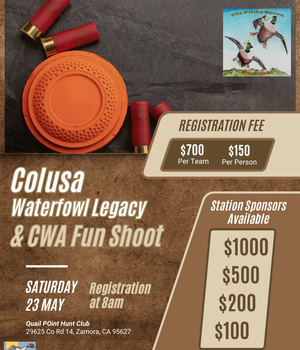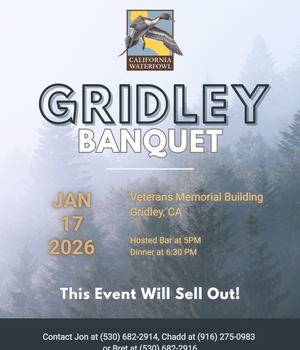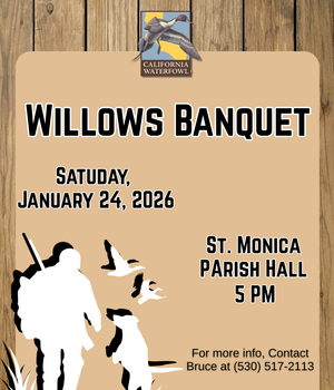 Join CWA for our annual Colusa Waterfowl Legacy Banquet at the Colusa Fairgrounds in the Main Exhibit Building. There will be live music, great food, great live and silent auctions and good people! This event is limited to 300 people so get your tickets early!