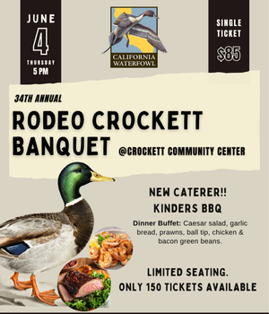 Come join us for our 34th annual banquet at the Crockett Community Center! Catered by Kinder's BBQ, this is an event you do not want to miss. Also Free ladies raffle, over 30 guns, sports memorabilia, hunts and more! Seating is Limited to only 150 people! Get yours now!