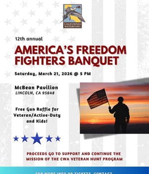 Join CWA to celebrate our 12th annual America's Freedom Fighters Banquet at the McBean Pavilion in Lincoln, CA. Free Gun Raffle for Veteran's/ Active-Duty Military and Kids! Tickets will go fast. Get Yours Today!